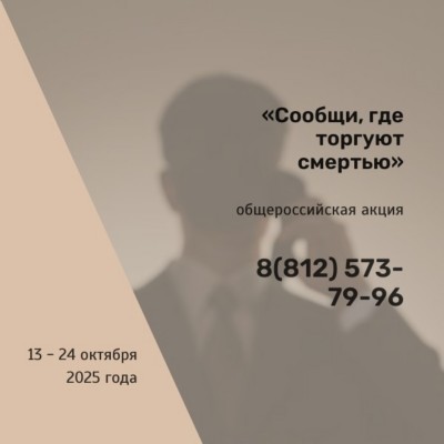 В период с 13 по 24 октября 2025 года в Санкт-Петербурге проводится II этап Общероссийской акции «Сообщи, где торгуют смертью». Акция направлена на привлечение общественности к участию в противодействии незаконному обороту наркотических средств и психотропных веществ, сбор и проверку оперативно-значимой информации.